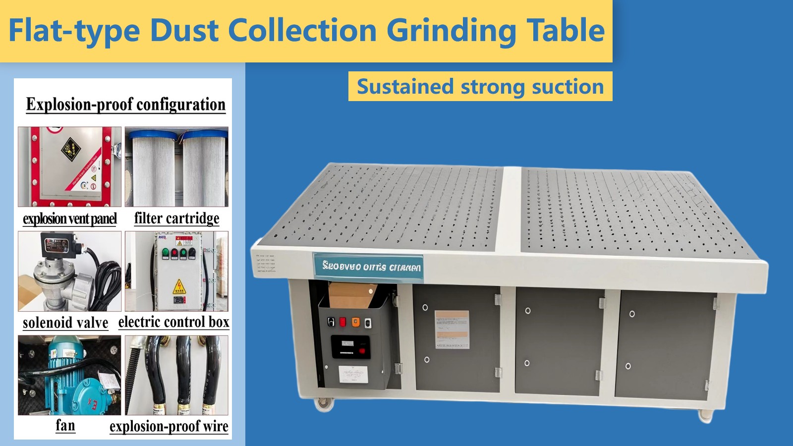 ຜົນກະທົບການເກັບຂີ້ຝຸ່ນທີ່ດີ: ຍົນແລະດ້ານຂ້າງຂອງຕາຕະລາງ sanding ຂີ້ຝຸ່ນຮາບພຽງແມ່ນອຸປະກອນທີ່ມີພອດດູດ, ເຊິ່ງສາມາດເອົາຝຸ່ນອອກຈາກຫຼາຍທິດທາງແລະປັບປຸງປະສິດທິພາບການເກັບຂີ້ຝຸ່ນ.